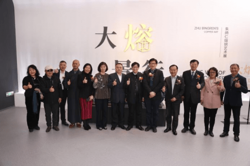 “大熔景行”朱炳仁熔铜艺术展出席嘉宾合影 作为朱炳仁近年来作品最多、规模最大的艺术个展,本次展览以“大熔景行”为主题,涵盖壁画、雕塑、装置等多种作品类型,旨在展现大运河沿线非遗铜雕传承与创新并蓄的独特魅力,为参观者讲述数千年使用史的铜,如何从青铜时代“逾越”,在朱炳仁的创新下千变万化,造就为一种新的熔铜艺术。