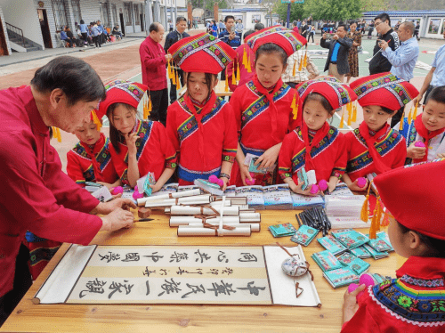 为弘扬和传承中华优秀传统文化,不断增强各族群众对伟大祖国、中华民族、中华文化、中国共产党、中国特色社会主义的认同,3月11日,河池市天峨县在桂黔(六县)铸牢中华民族共同体意识研学基地,邀请广西社会道德文化研究会和来自桂黔(六县)的各族群众和青少年代表举行“同心同德绘蓝图桂黔共谱和谐曲”主题活动。 活动中,来自广西社会道德文化研究会的书法家在研学基地操场上摆好画纸、毛笔,由1名书法家用巨型毛笔在广场中心书写大型“德”字,5名书法家围绕大笔书法家书写“同心同德”“守望相助”“共同富裕”等字,另外4名书法家在第一圈外四面书写“民族团结”四个大字。