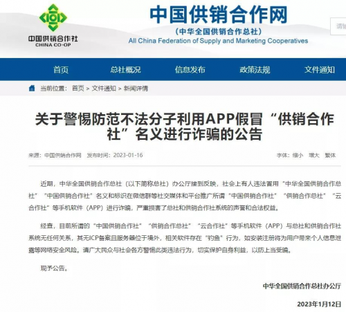 近日,日照银行市直一区社区支行阻止了一次新型“供销社”诈骗。一位老年党员客户来行,要求员工帮助他在一款叫做“中国供销合作社”的app上绑定自己的身份信息及银行卡信息。该客户称国家要求重启供销社,现在签到一次,奖励客户500元钱,该客户已签到3万元,需要在该app上绑定自己的身份信息及银行卡信息,缴纳一定数量的工本费才能拿到3万元。该行员工了解情况后,认为该“供销社”app疑似诈骗骗局,遂第一时间上网搜索有关“供销社”信息,果然搜索到该app为诈骗平台,后劝阻该客户凡是让先交钱再给钱事情都是诈骗,并出示网上搜索到的诈骗案例给客户看,并耐心给客户解释后,客户恍然大悟,卸载该APP后随即离开。