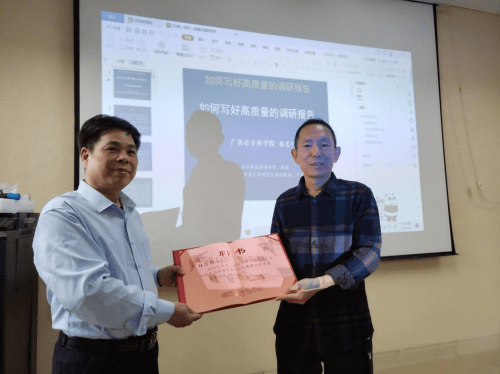 林忠伟教授讲座现场 林老师指出,要写好一篇高质量的咨政(调研)报告,实地调研很重要。当前,社科界整体调研水平有待提升,结合实践少,领导关注度不高,能够解决实际问题少之又少。这主要是实地调研效果不好。搞创新必须深入调研。没有调研就没有发言权。那些“下车伊始”就呱呱乱叫的人,他们的研究成果肯定没有生命力。有不少的研究者,就是喜欢网上下载,或者去调研时仅仅根据调研单位提供的资料,大段复制粘贴采用。这样的效果比较差,因为单位给你提供的年度总结,被一而再,再而三的打磨,那些精华的,有价值的东西都被打磨调了,剩下的只是些冠冕堂皇的话,那是用不上的。对男同志来说,下基层,一包烟,一瓶酒跟老百姓套近,得到的都是百分之百的真实,老百姓没有多大的理论水平,但这些都是解决问题的方法。地方干部说话做事有所保留,老百姓没有后顾之忧。你对老百姓尊重,老百姓就会将心底话掏给你,得来的调研价值就很大了。 林忠伟教授强调调查研究是每一位研究者的基本功,只有沉下身子、脚踏实地地做细做好调研工作,才能真正提出有针对性、经得起检验和推敲的真知灼见,服务于国家经济社会发展大局,研究成果才能获得高层领导的青睐和党委政府的采纳,从而转化为惠民利党的生产力。 一、标题(选题)很重要。标题(选题)起得好,已经成功了一半。标题(选题)起得简明扼要、切中时政,引起阅读者想阅读下去的兴趣,这就算成功了一半。 二、调研方法论或者诀窍很重要。调研得到的材料必须真实可靠。现在常态下,无论是集体性调研与写作的课题组还是个人研究,到各市、县(区)、乡镇调研,采取的都是现场召开座谈会,由官方提供纸质或电子版有关材料,一般都会如获至宝,很多人都整段整页的照搬材料里的内容,就理所当然的认为这是最接地气的调研报告了。 三、研究成果核心很重要。克服“洋洋数万言不着边际”的常态化研究模式。带有全局性的战略需求,提出一系列接地气的可操作性较强的对策建议,而非泛泛而谈,陷入空洞的理论。所以必须真正掌握正确的调研方法,才能赢得高层领导和党委政府的重视。 四、写作水平很重要。这个是老调重弹了,凡是和文字打交道的,都必须具备一定的写作水平,就算在一家普通的公司做事,写一份总结,搞一个调查报告,包括日常公文办事等,都离不开写作,在行政机关事业单位工作更不用说,基本是天天与写作打交道,对外单位写公文,写作水平太低就会丢单位的脸,给本单位领导写公文写作水平太差就会影响进步提拔重用,这是最基本的写作要求,更何况是高质量的咨政(调研)报告更是需要具备一定的写作水平,做到通顺流畅,文采飞扬。 五、悟性很重要。所谓悟性,是指对事物的感知力、思考力、洞察力,主要指对事物的理解能力和分析能力。每个人的悟性是不一样的,它由先天和后天因素共同影响,不过每个人的天赋则是天生的,其可以使人在某方面事半功倍,甚至成为才赋优异的神童。悟性是一种智慧的体现。聪明人一拨三转,糊涂人捧打不回,这就是有无悟性的区别,智慧有大小,悟性同样也有大小之分,悟性高,知天晓地,明古道今,运筹帷幄,决胜千里之外。 六、平时多关注新闻新动态和政策走向很重要。我们平时多收看电视、报纸、网络新闻,注意观察和思考自治区领导的讲话精神。也就是说,领导新闻导向很重要。因为信息不对称的原因和地位不对等获得的信息有限,研究者平时只有通过收看电视、报纸、网络新闻来留意自治区领导的动向与讲话精神,了解到党委政府当前注重的建设方向与关注的民生问题,从中寻找蛛丝马迹,养成习惯,花费点时间看看新闻即可,现在资讯这么发达,获取新闻价值的渠道很多,通过自己天赋的和后天培养的悟性,从中找到有价值的研究选题一点都不难。 讲座将近两个小时过去了。林忠伟教授最后指出,外行看热闹,内行看门道。我们作为研究者要善于发现新东西,善于反映民生问题。我们要与祖国的命运联系在一起,吹响中国式现代化建设的时代号角,擘画了以中国式现代化全面推进中华民族伟大复兴的宏伟蓝图。我们应当有所作为。