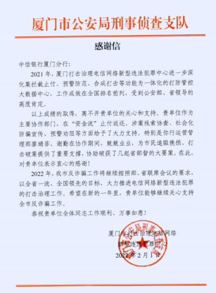 ——中信银行 “哨兵” 智能反欺诈 系统主动保护被诈资金超亿元 近年来,中信银行践行“金融为民”理念,持续构建电信诈骗防范体系,深层次筑牢金融反诈防线,打击电信网络诈骗、切实保护消费者权益,有力保障了客户资金安全。 联防反诈警银协作成果显著 针对反诈的难点,中信银行紧盯技术反制,通过工作专班机制和多层级考核体系,压实各级责任;健全账户分类分级管理机制,根据客户需求及其特征,匹配合理的非柜面交易限额;应用人脸识别技术,对高风险账户或业务进行增强核验,有效防范账户“实名不实人”;上线手机号实名核验功能,提高客户预留信息真实性;充分运用大数据、图谱分析等技术,提升防控能力。 同时,中信银行强化警银协同,加大与公安、通信等部门协作配合,及时对公安部门移送的涉案、可疑等风险账户进行管控;完善对接有权机关系统,支持有权机关快速管控涉案资金;积极向公安部门提供风险线索,为涉案人员抓捕和案件侦破提供助力,全面开展“断卡”行动,牢牢守住人民群众的“钱袋子”。 2022年全年,中信银行“哨兵”智能反欺诈系统通过电话核实、弹窗警示、交易阻断等机制,主动劝阻被诈骗客户860人,拦截资金1.12亿元;查控涉赌涉诈账户2.34万户,管控资金2.65亿元。由于在警银协作反诈过程中的突出表现,中信银行各地分行在帮助客户阻断金融诈骗后,受到当地公安机关的表扬或感谢,对中信银行在打击治理电信网络新型违法犯罪方面的积极配合表示肯定。