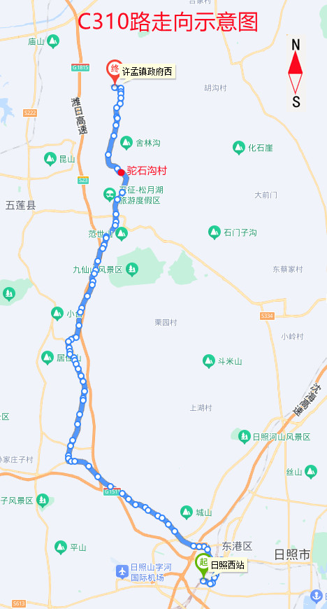 杏花花期:3-4月份 乘坐公交线路:C310路(日照西站-许孟) 停靠公交站点:“驼石沟村”站点 发车班次时间:日照西站6:30、9:35、14:00、16:30;许孟6:00、9:00、14:00、16:30。