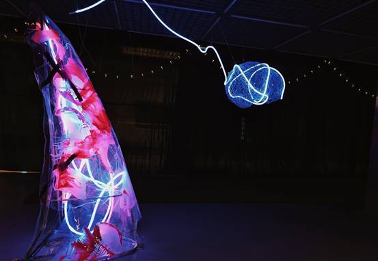 除此之外,现场的主舞台设计了多场不同主题的Web3内容的活动,如元宇宙知识分享论坛、虚拟乐队和元宇宙cosplay等,将元宇宙的更多层面展示给观众。 进入到市集,封闭空间的中央有一个醒目的艺术作品装置《帆》,一架充盈着蓝紫色光芒的船帆,在顶部延伸出一条光线缠绕着一颗炫富的大脑,寓意着前进的需求驱使人类思想意识的变革,脱离身体,从现实走向虚幻,是一段惊喜和危险并存的旅程。在它的四周环绕的是NFT艺术IP的作品,它们或悬浮在空中,或呈现在屏幕里,风格迥异,给人带来强烈的视觉冲击。