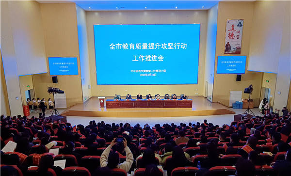 会上,市教体局党委委员、副局长谷成达宣读了书香校园、劳动教育实验校、教育质量提升攻坚行动先进集体和个人的表彰决定,举行了颁奖典礼。受表彰的先进单位、先进个人和教学能手代表先后发言,分享交流教育质量提升的经验和做法,为教育质量提升工作赋智赋能。市教体局党委委员、副局长吴有丽对全市2022年中小学学生综合素质监测、初中学业水平考试、高考作全面深入的质量分析报告,反思存在的短板弱项,提出科学可行的举措。市教体局党委书记、局长张俊生学习传达省、州教育体育重点工作相关会议精神,对教育质量提升攻坚行动工作进行再强调再部署。