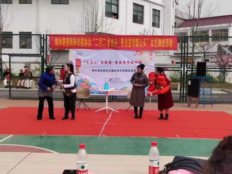 各村居都成立了文艺宣传队,村村锣鼓响,处处闻歌声。这次,响水县益起来公益协会牵头举行“二月二龙抬头,普法宣传记心头”活动,全镇10多支群众文艺团队、文化志愿者队伍踊跃参加。台上,小品、乐器、快板、舞蹈等节目尽情上演,小品《媳妇整婆婆》等节目以身边案例剖析民法典,事例鲜活接地气,答疑解惑明事理,进一步加深群众对民法典的认识和理解。