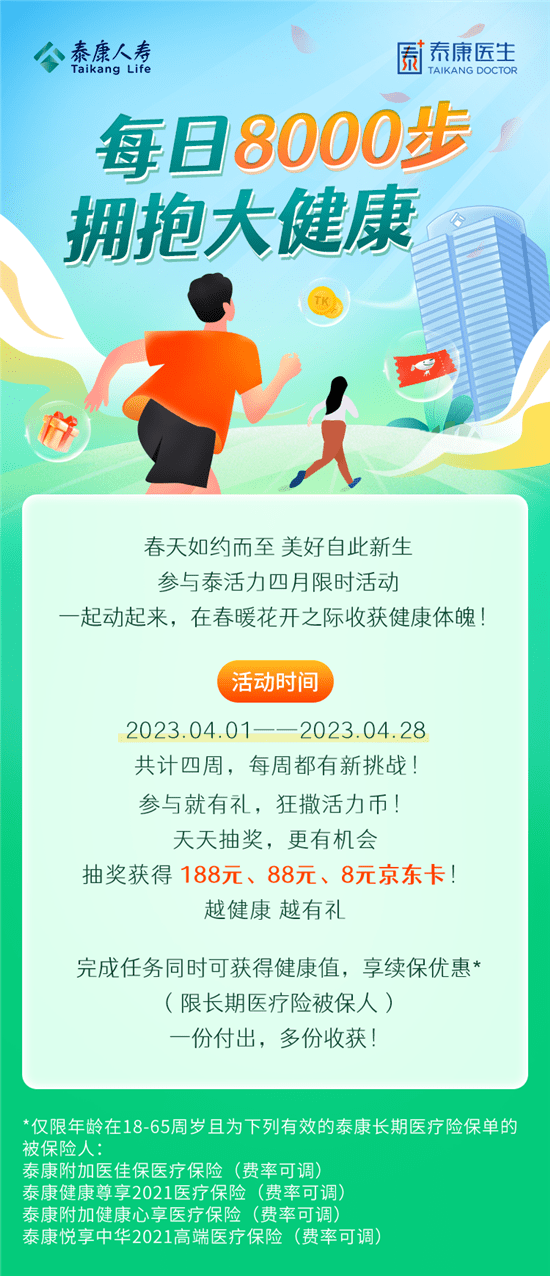 泰康人寿4月发起主题为“每天8000步,拥抱大健康”的健步走活动,所有泰康医生APP用户均可通过泰活力计划报名参加。 运动赢好礼,拥抱大健康 本次活动时间为4月1日至4月28日,主要设置两项挑战:计步挑战和超体打卡。 4月1日起,用户每周都可报名参加计步挑战。完成挑战后,用户可获得相应的积分奖励,积分可用于泰康医生APP上的抽奖和兑奖。前200名完成计步挑战的用户,还有机会获得颈椎热敷枕实物奖励。为提升用户参与性,活动专区单独设置抽奖活动,所有参与用户都有机会获得最高188元的京东卡奖励。 4月15日至4月28日,用户可参与“超体打卡”挑战,通过参观泰康大健康实体,亲身感受泰康在大健康领域取得的成果。打卡后,用户也会获得积分奖励。本次活动打卡地点覆盖全国37家分公司、320多家中支、117家健康财富体验中心、14家泰康之家养老社区。 依托泰活力 泰康人寿探索“保险+健康管理”模式 泰活力计划是一个面向泰康客户的健康促进计划,通过提供“陪伴式”的健康管理服务,在生活场景中植入健康理念,融入健康科普、健康评估、运动管理、睡眠管理等一系列健康管理过程,唤醒健康意识,提升身体素质,帮客户养成健康生活习惯,防病于未然。 2021年8月,泰康人寿通过“泰活力计划”将健康管理服务与续保保费动态关联,推出了系统内首款互动式保险——《泰康附加医佳保医疗保险(费率可调)》。“泰活力计划”引入“健康值”概念,通过量化客户的运动和健康状况,向符合条件的指定长期医疗险客户提供续保优惠。客户完成健康任务越多,健康值越高,所获得续保费率就越低。如今,泰活力计划已与四款泰康长期医疗险对接。 截至2023年3月,累计有近4万位泰康客户通过“泰活力计划”获得续保优惠资格,其中近82%的客户已经享受到续保优惠。该计划累计为客户节省保费近450万元,相较于没有参与“泰活力”的情况下续保,客户最多节省了990元。 泰活力计划 助力客户持续性健康习惯养成 泰活力计划以日、周、月为周期,为用户设置多维度健康任务,用户可通过健康值随时了解自身健康管理情况。 2021年8月,张山先生(化名)在泰康代理人邀请下,注册下载了泰康医生APP,并加入了泰活力计划。此后,他每天都坚持完成早起打卡、活力日贴、活力计步等健康任务。在2021年年底泰康医生APP生成的“个人年度健康足迹”报告中,张山先生发现他所获得的健康值超过了平台100%的客户,这让他很有成就感。 张山先生说:“发生意外和疾病时,泰康是我的保障,我们也要主动参加运动增强体魄,尽量不生病。加入泰活力以后,我每天都登录APP做健康任务。每天至少同步8000步的步数,督促自己坚持锻炼;每日答题,帮助我了解很多健康和养生的知识,对生活习惯有正确的引导意义;每天早上起床打卡,会提醒我养成良好规律的作息习惯。泰康医生APP使我更懂得如何健康生活,让作息更规律,坚持体育锻炼,增强了体质,我会一直用下去。” 2022年6月,张山先生在保单期内积累健康值1850,获得续保优惠资格,对应续保费率0.8,相较于没有加入泰活力时续保,节省了20%的费用。 深耕寿险多年,泰康人寿一贯致力于为客户提供“健康保险+健康服务+生态”的健康解决方案。依托泰活力计划向全社会推广健康的生活方式,通过健康促进的手段提升客户健康水平,既是泰康人寿大健康战略的题中之义,也是泰康践行“健康中国2030”,落实“以人民健康为中心”的重要举措。 |