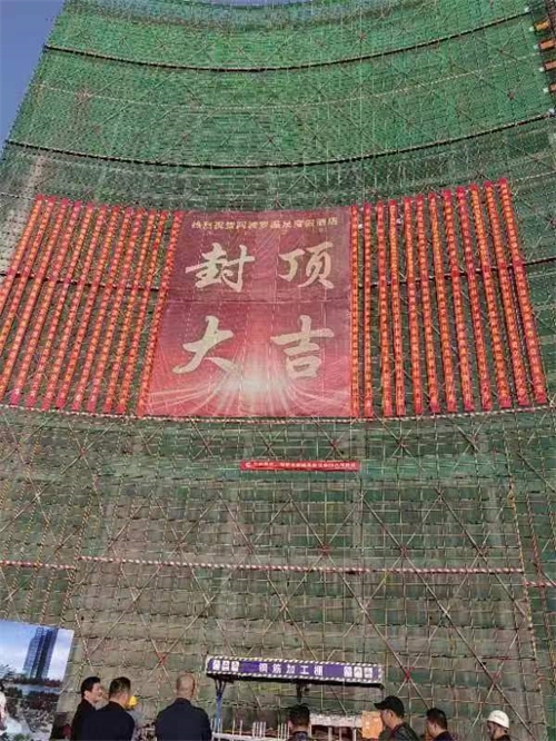 现场人头攒动、彩旗飘扬,封顶仪式在一片热闹祥和的气氛中圆满举行。