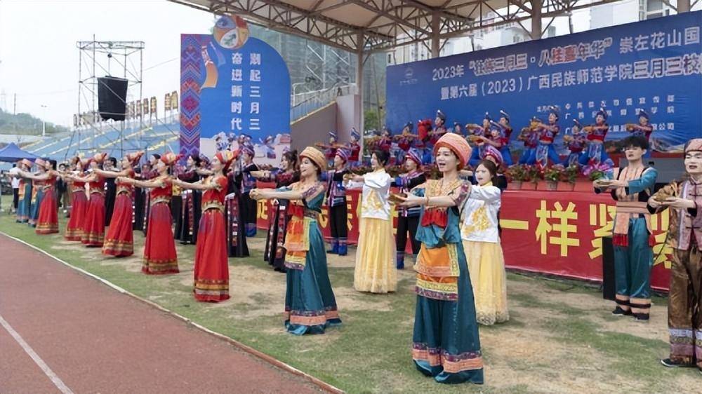 “尼的呀,尼的呀,美丽的广西谁能不爱它……”伴着优美的旋律和动听的歌声,2023 年“壮族三月三•八桂嘉年华”崇左花山国际文化旅游节开幕式暨第六届(2023)广西民族师范学院三月三校园民族文化艺术节于4月18日在广西民族师范学院举行。
