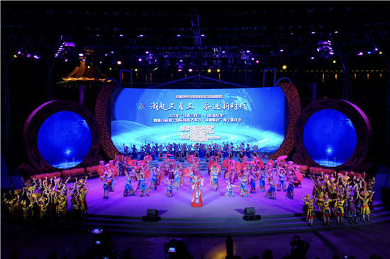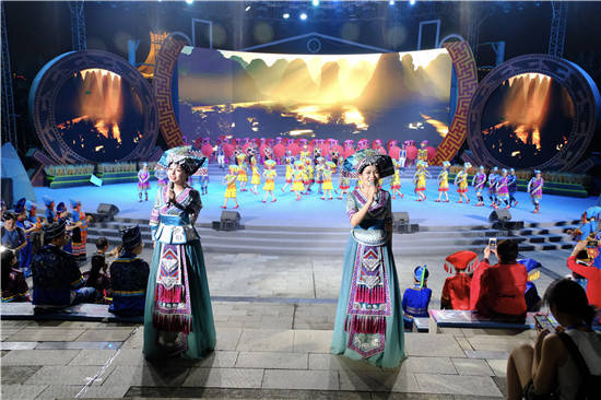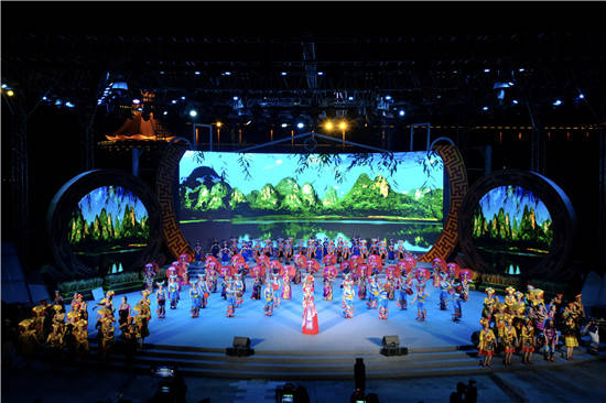 晚会由第一篇章《山水之音》、第二篇章《团结之歌》、第三篇章《世界之谣》、第四篇章《传扬四方》四个部分组成。 第一篇章以《山水之音》为题,以原生态山歌情景表演表达了在广西这片热土上,以12个世居民族为代表的各族人民生生不息,用勤劳、勇敢和智慧,浇灌出八桂大地的美丽富饶。《多耶》《歌的家乡》《美丽姑娘赶歌圩》…用歌声、鼓声、欢笑声,编织出壮乡歌海的多彩风情。