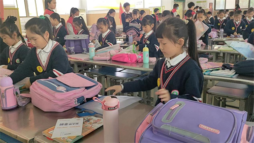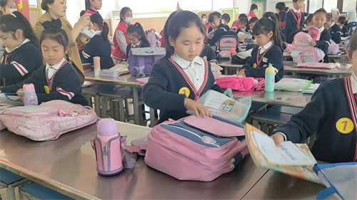 一年级的孩子们将书本、文具、物品等全都整齐地摆在桌面上,随着老师一声令下,同学们迅速将物品分门别类地装进书包。在短暂的时间内,就把书包收拾得整整齐齐啦!