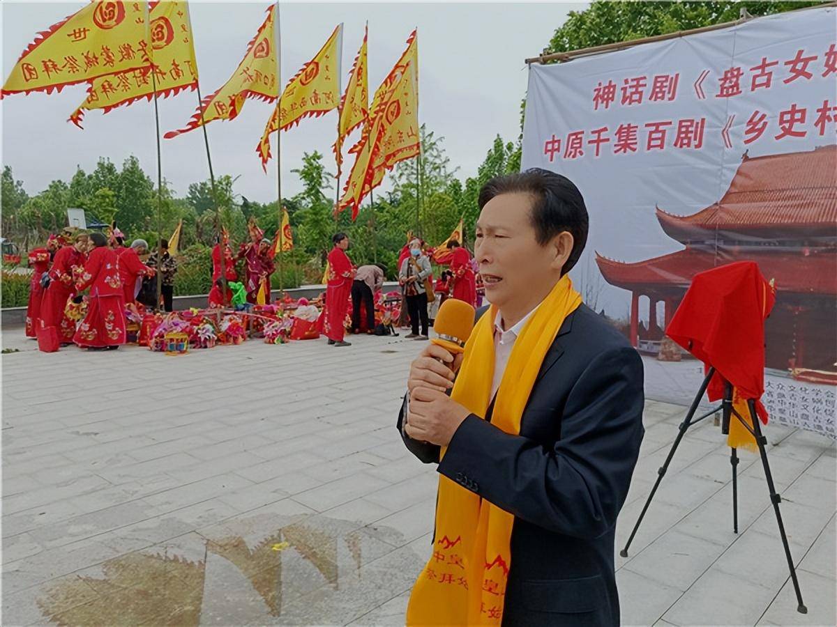 《乡史村史》微电影组委会主任齐东升致词 5月4日上午,开机仪式在一片祝贺声中拉开序幕,首先河南中皇山盘古女娲文化研究院院长、河南中皇山古遗址景区负责人陶建军先生致欢迎词,陶先生说盘古女娲两位创世神功高日月、德配天地,今天我们用新媒体的手段、微电影的方法颂盘古女娲创世圣德、扬盘古女娲创世文化,为讲好中国故事做出自己的努力。而后中国大众文化学会盘古女娲创世文化专业委员会、河南盘古女娲创世文化研究会会长、原西华县人大主任、盘古女娲创世文化研究专家耿宝山先生就拍摄《盘中古女娲创世传奇》的历史和现实意义,盘古女娲创世神话在西华影响,盘古女娲创世精神的当代价值等做了精彩的分享。中原千集百剧《乡史村志》微电影组委会主任齐东生先生也向嘉宾介绍了拍摄该剧的相关筹备情况、组建《乡史村志》组委会的初衷使命、《乡史村志》以后的发展方向等,并立志举公司全力,一定要把《盘古女娲创世传奇》这部微电影拍好,以颂盘古女娲圣德,也不辜负各位领导各界朋友的一片希望,
