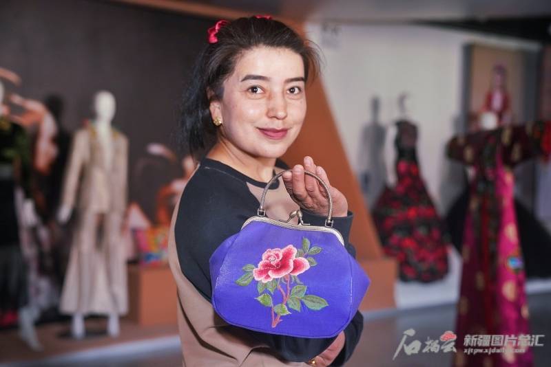 5月10日,哈密市传统工艺工作站传统工艺传习所,一名学员展示制作精美的刺绣手包。