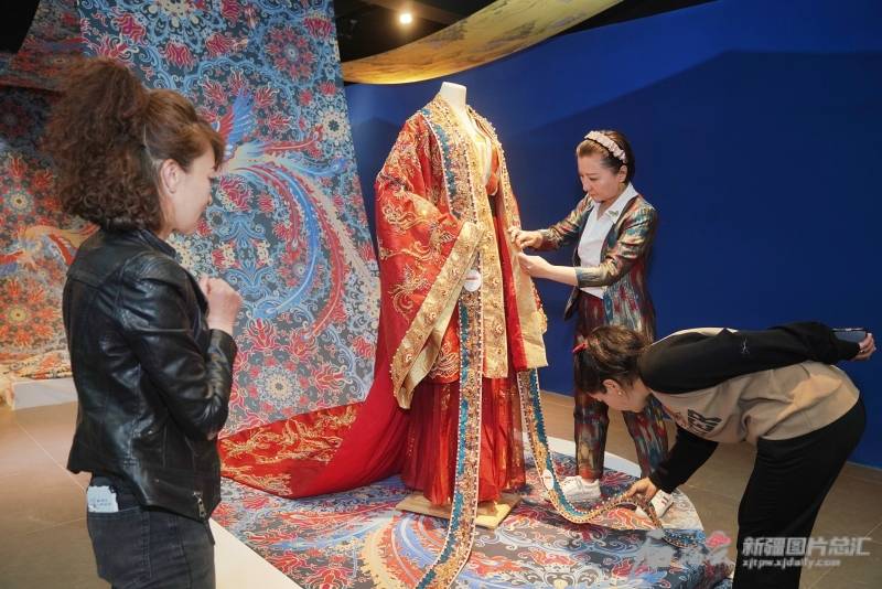 5月10日,哈密市传统工艺工作站刺绣展厅,学员们在布置一件制作精美的刺绣服装。