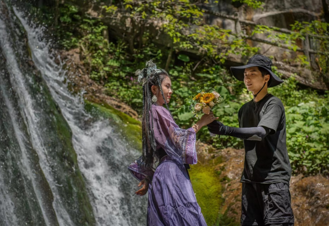 来自北京的丰先生说:“年轻人以这种‘穿越千年去告白’的形式表达对爱情的忠贞,既弘扬了传统文化,又升华了爱情,是一种正能量,值得褒奖。” 来自郑州的赵先生是一名摄影师,当天正在瀑布下拍摄,全程记录下了现场发生的故事。他说:“洛阳全城大穿越,汉服火爆出圈,重渡沟作为一个山水景区,境内小桥流水,茂林修竹,到底什么服装在这里拍照才美?今天宋先生给了一个最好的诠释,洛阳的汉服,老君山的斗篷,重渡沟的‘美人蝶’。”(赵树岭 封君 乔小乔) |