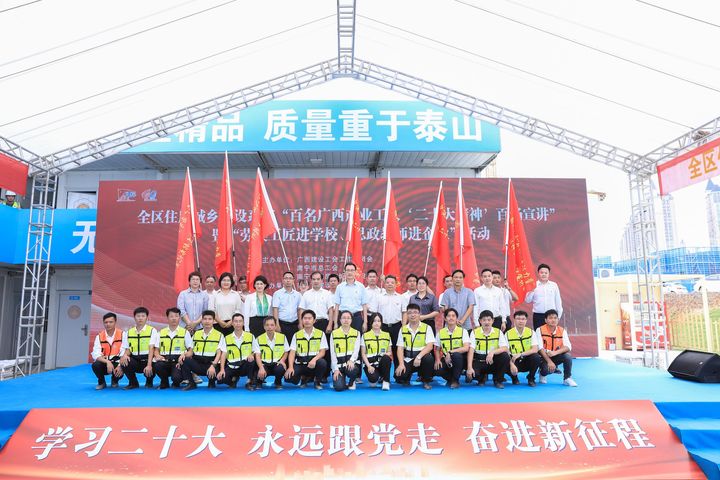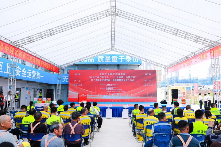 5月26日,由广西壮族自治区总工会、广西壮族自治区教育厅、广西建设工会工作委员会、南宁市总工会主办,南宁市建设工会、南宁威宁房地产开发集团有限公司、中建八局广西分公司承办的2023年“百名广西产业工人党的二十大精神百场宣讲”暨“劳模工匠进学校、思政教师进企业”活动的首场专场宣讲活动在中建八局广西分公司南宁市第九中学高中部新校区项目举行。