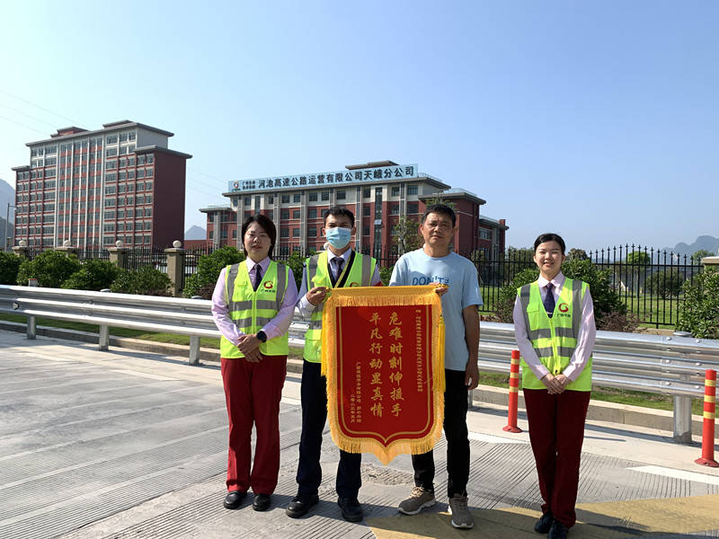 “真是太感谢你们了,为我们争取了救治时间,要不是你们出手相助,后果不堪设想!”5月31日,司乘郭先生的家属带着一面写着“危难时刻伸援手,平凡行动显真情”的锦旗来到天峨收费站,对收费站员工助人为乐的精神表示感谢。