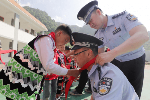 少数民族留守儿童为民警佩戴红领巾。蒙正欢 摄