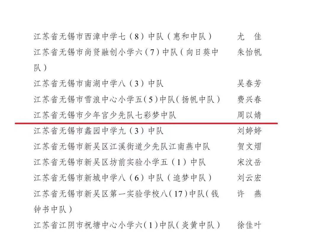 近日,无锡市少年宫少先队七彩梦中队荣获全国少工委命名的2023年度全国红领巾中队称号!这是对无锡市少年宫全体队员辛勤努力和出色表现的最大认可,也是无锡市少年宫共同努力的成果。 在过去的一年里,无锡市少年宫少先队七彩梦中队的每一位队员都积极参与各项活动,展现出了优秀的红领巾精神和团队合作能力。无锡市少年宫在各项比赛和考核中取得了优异的成绩,在地区和全国级别的比赛中脱颖而出。这些成绩的取得离不开每一位队员的努力和奉献,也离不开家长的支持和鼓励。 获得全国红领巾中队称号是对无锡市少年宫的肯定,更是对无锡市少年宫未来发展的鞭策。无锡市少年宫将继续保持团结协作的精神,不断提高自身素质和能力,为实现中华民族伟大复兴的中国梦贡献自己的力量。