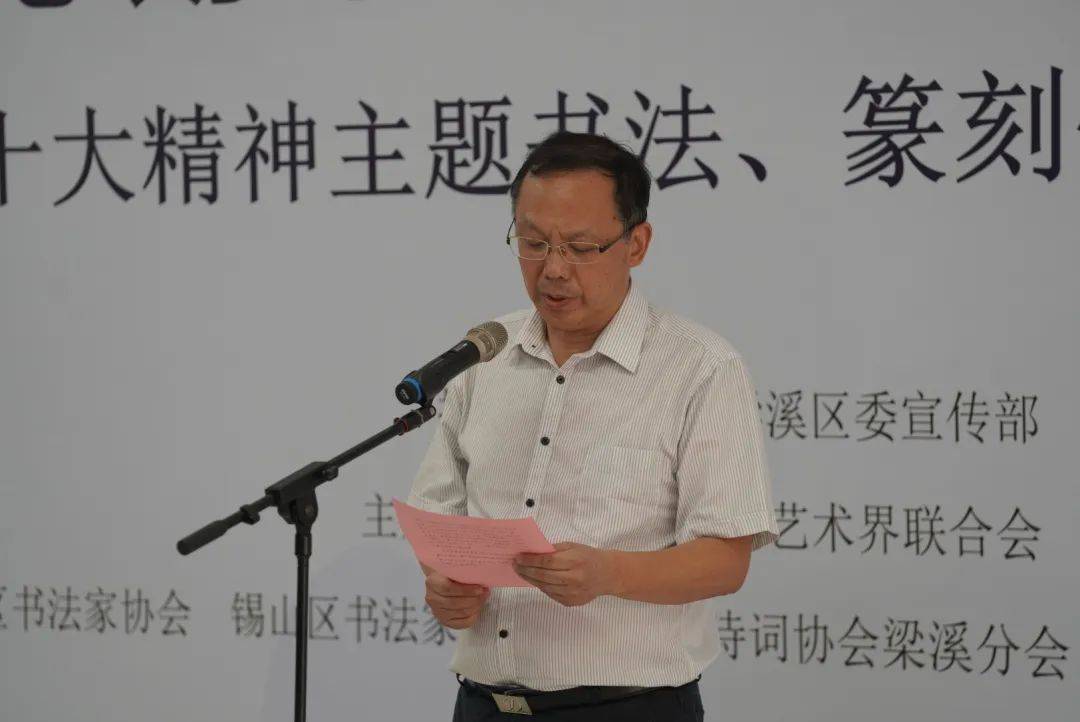 锡山区书协执行主席王剑做总结发言,以五个方面的收获充分肯定了本次联展的成功举办,并希望继续努力,积极响应并落实市区两级文化高质量发展大会的号召,进一步实践笔歌新时代,墨舞好溪山。