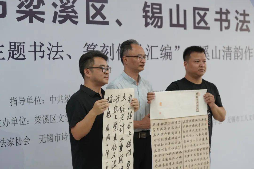 梁溪区委宣传部常务副部长孙晓娜、锡山区委宣传部副部长蒋盛向梁溪书协、诗词协会、锡山书协、诗词(楹联)学会代表赠送本次展览作品集,并合影留念。