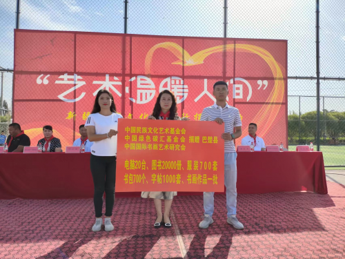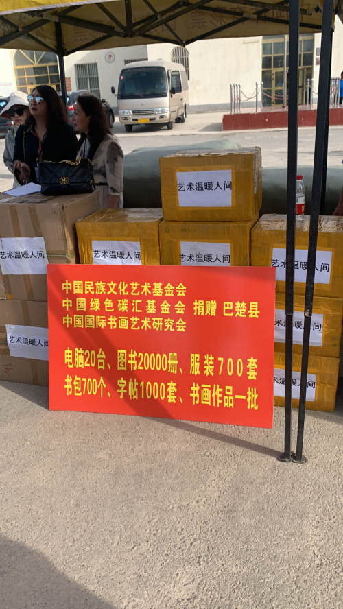 本次活动为新疆喀什市巴楚县阿纳库勒乡(曲许尔盖(5)村、库木博古孜(4)村)、新疆博尔塔拉蒙古自治州博乐市小营盘镇铁日木不拉格村三所学校筹备了价值60余万元物资(含字画)。其中校服700套;电脑20台、图书12000册;书包700个、150张“弟子规”碟片、艺术家作品60余幅;12名特困生每人得到组委会发放的助学金1000元(总12000元)。