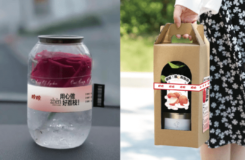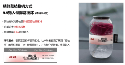 -辽策项目组头脑风暴中- 最终在经过多轮的头脑风暴后,制定了一个果饮快销品比较新奇的推广形式——“荔枝鲜果试吃与调饮”让珍友亲自检验珍珍荔枝的品质。于是一颗颗珍珍鲜果每天坐着飞机从广东飞到东北来跟珍友见面,让珍友品尝珍珍的荔枝鲜果,从原料放大珍珍的纯度认知,自源头发掘荔枝与珍珍的关系。 -推广部分包装形式-