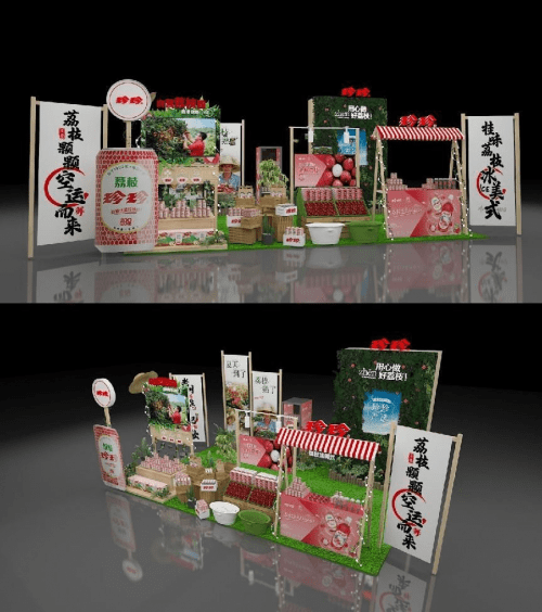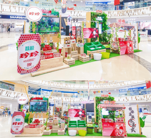 -珍珍快闪店设计稿- 索性大胆尝试,从原材料出发,以荔枝生长环境为参考,还原果农丰收的热闹场景,不仅主题独特,更能让消费者在参与的同时感受来自远方珍珍鲜果产地的亲切,同时,在实景展现上,拿捏设计细节,百分之百将场景呈现。
