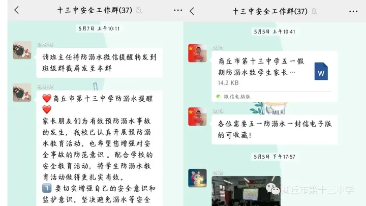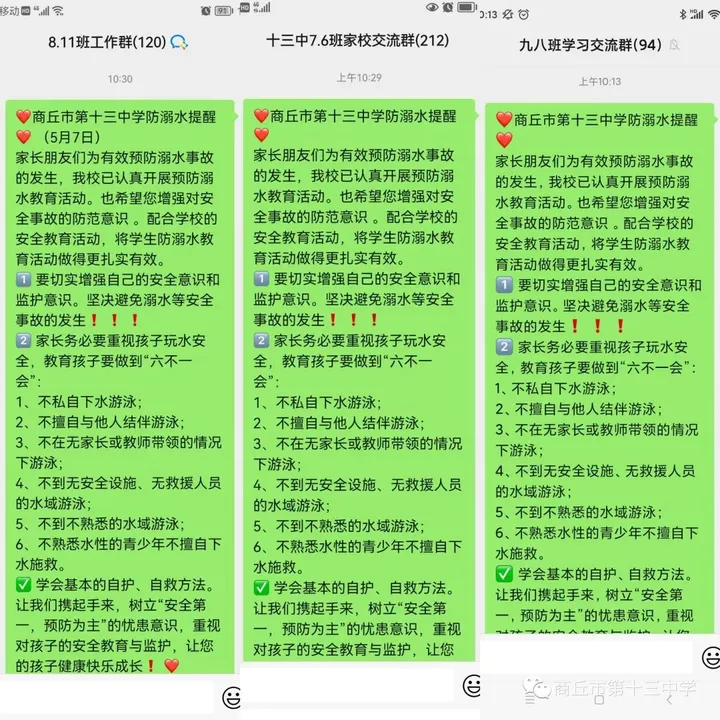 通过微信群向家长发送安全教育提醒。指导家长做好孩子的安全监管和教育。多关注孩子的活动,保持警惕性,保障孩子生命安全。 做好周末安全提醒发送工作。提醒学生注意防溺水安全,过一个愉快的周末。 ![]() ![]() 我校将继续把防溺水安全教育工作纳入常态化。进一步完善学校安全管理制度,把预防溺水教育作为一项长期工作抓紧抓好,特别要求教师把这项教育工作渗透到教育教学和学校管理之中,警钟长鸣,常抓不懈,保持和学生家长或监护人联系,关爱留守儿童,关心务工随迁子女,杜绝管理盲点,避免溺水事故发生。将预防溺水安全意识真正深入人心,为构建平安、和谐、文明校园开辟一条绿色通道,为学生健康、快乐成长保驾护航! |