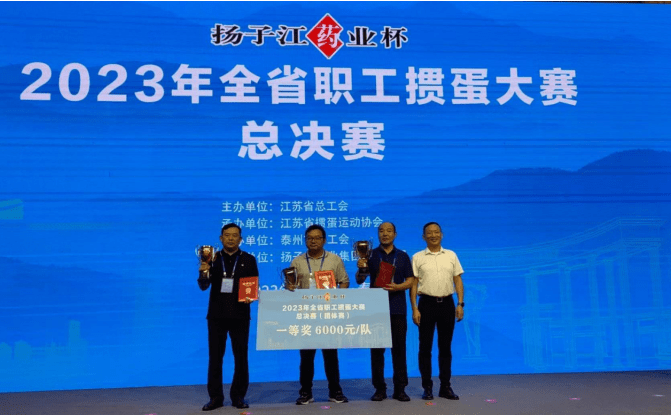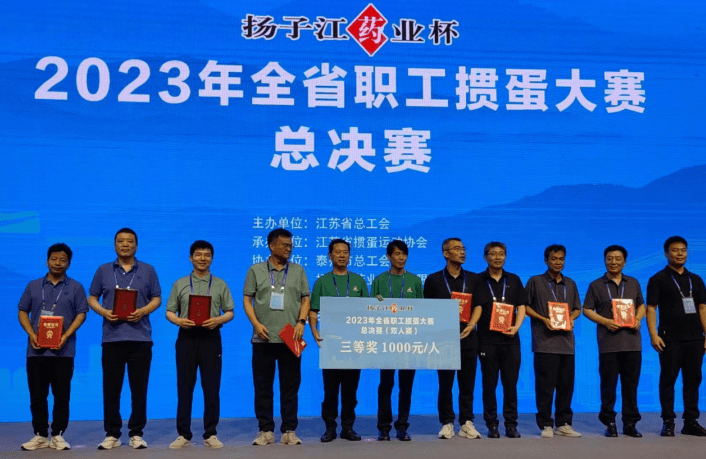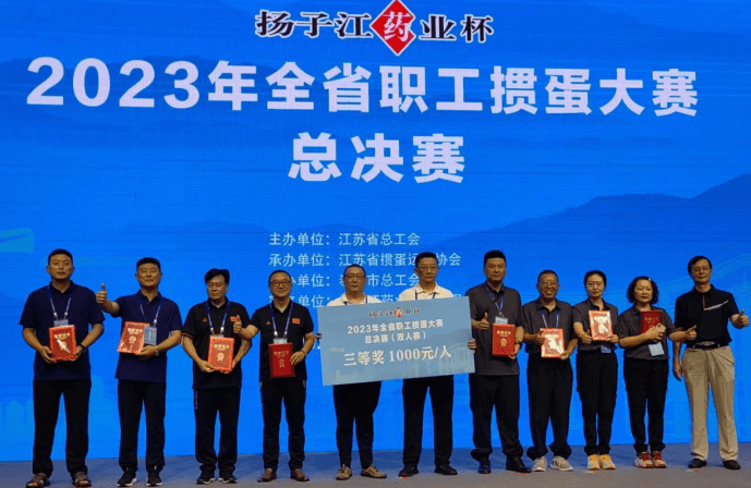 江苏省掼蛋运动协会副会长、总裁判长姚继平宣布比赛成绩 经过一天的紧张角逐,获得大赛双人赛一等奖的3对6名是:苏州市总工会的顾建忠、吴祝琴;省电信工会的张永兵、张安奇;南通市总工会的王卫国、赵建军。 获得大赛双人赛二等奖的是扬州市总工会刘才宝、周祥,省地质局工会张少云、曹秀绪,连云港市总工会掌波、高新滇等5对10名掼蛋运动员。 获得大赛双人赛三等奖的是南通市总工会朱祝言、孙骥,省交通运输工会杨金国、邢鑫,省电力工会蒋青松、蒋伟兴等10对20名掼蛋运动员。 获得大赛团体赛一等奖的3个代表队是:泰州市总工会、连云港市总工会、省直机关工会。 获得大赛团体赛二等奖的5个代表队是:常州市总工会、省地质局工会、徐州市总工会、省电信工会、南通市总工会。 获得大赛团体赛三等奖的8个代表队是:扬州市总工会、无锡市总工会、苏州市总工会、淮安市总工会、盐城市总工会、省交通运输工会、省电力工会、省机冶石化工会。