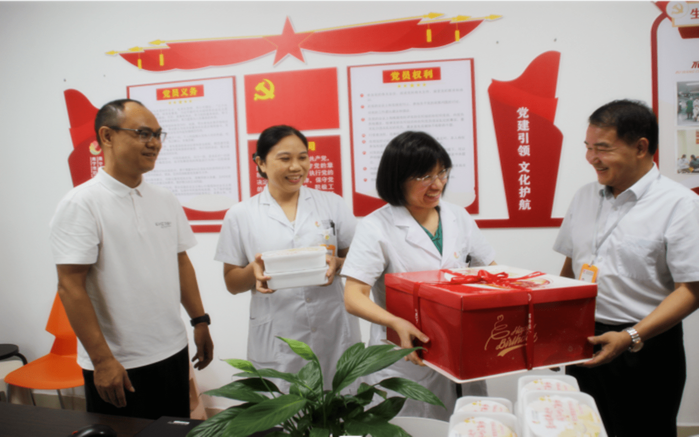 在当天中午送餐员”身份的院领导与职能科室人员组成医师节送祝福小组,给一直忙碌在临床一线的医务人员送去了一盒盒暖心的“手作”饺子和节日蛋糕。他们向所有医务人员致以节日的关爱和美好祝福,并希望大家始终坚定不移地遵循“术道精诚 拓新笃行”的院训,用更精湛的医术、更优良的作风,毫不保留地为妇女儿童健康服务。
