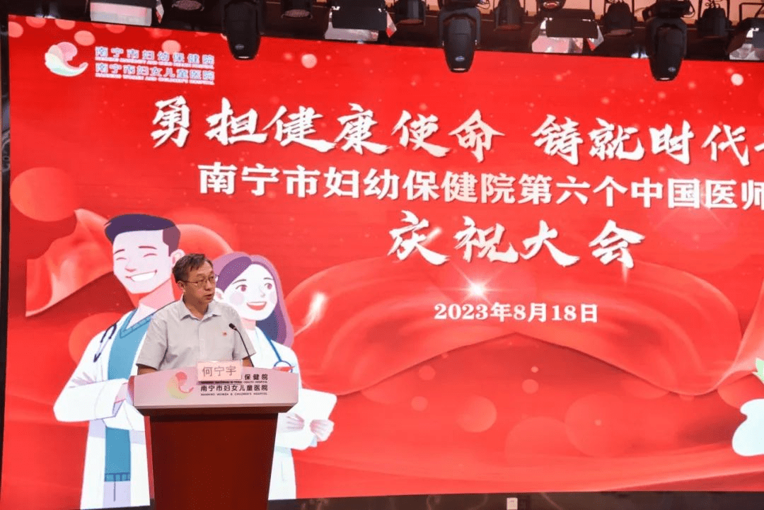 大会上,南宁市妇幼保健院院何宁宇代表医院向全体医师同仁致以节日的祝贺,并为医院高质量发展建设做出奉献的每一位妇幼人表示感谢。他在致辞中表示,近年来,在上级党委政府及市卫生健康委员会的坚强领导下,医院各项事业不断发展,就医环境逐渐改善,医师队伍不断壮大,经济效益和社会效益稳步攀升,医疗服务和医疗保障水平持续提高。这些成绩的取得离不开全体医务人员职工们不畏艰难、一往无前、无私奉献的奋斗姿态和精神状态!何宁宇希望大家继续保持奋发向上、勇于开拓的精神,毫不保留地为妇女儿童健康挺身而出,并倍珍惜人民的重托和信任