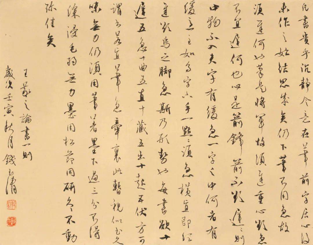 清代朱履贞提出“学书六要”,一气质,二天资,三得法,四临摹,五用功,六识鉴,六要俱备方能成家。前五要皆达而第六要未及,依然不能称书家。识鉴需要思考、需要辨析、需要考问,说得透彻一点,需要理论学养。钱玉清特别注重对书法理论的参悟,热衷从中华千年书法理论精髓中汲取营养。他坚持认为,脱离理论指导的书法实践,难以形成艺术风格。这与黄庭坚的观点“学书时时临摹,可得形似。大要多取古书细看,令入神,乃到妙处。惟用心不杂,乃是入神要路”一个理。“细看”而得古人书法之精神。“用心不杂”而终有所悟,某种意义上说,不就是要理论探究吗?习与研,研与习,钱玉清齐头并进,经年累月。每每揣摩张怀瓘、苏东坡、王铎、范公勉等大家的书法论语,他常常审问自己是否具有这样俯瞰的高度,于是新的渴望再次拔地而起。