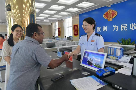 “What can I do for you, sir(先生你好,我可以为你提供什么帮助吗)?” 8月25日上午九时,东光县税务局办税服务厅双语服务岗工作人员陈茹、杨钰静正在在热情地接待来自孟加拉国的外籍人士莫森·比斯瓦斯。经过简短的英文交流,税务干部了解到莫森近日在我县开办了一家进出口公司,于是在中国助力人员的带领下,前来税务局办理税务登记事项。得知这一情况,税务干部非常热情地迅速帮助外籍纳税人办理填表、登记、实名制认证等业务,同时赠送新办纳税人双语礼包,并提供个性化服务,让纳税人应知尽知。仅用了8分钟时间就为这位东光县首位外籍纳税人办理完毕所有业务,莫森激动地举起大拇哥说道:“Thank you so much(非常感谢), 赞!”