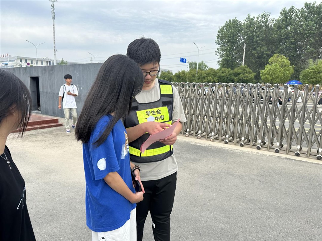 “奋斗是青春最亮丽的底色,行动是青年最有效的磨砺。有责任有担当,青春才会闪光。”身穿工作服的学生会志愿者们十分引入注目,“同学你好,欢迎来到‘工业中专’!”“家长您好,行李可以交给我们。”他们有序地为新生搬运行李、指引方向并解答各种问题,忙得不亦乐乎。另外一部分学生会的同学则手持《纪念抗日战争胜利七十八周年倡议书》,向来来往往的学生和家长进行宣讲和倡议,启迪同学们,要珍惜如今来之不易的和平生活,要始终牢记,今天和平幸福的美好生活,是无数革命先辈抛头颅洒热血,不怕牺牲换来的。