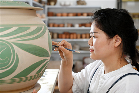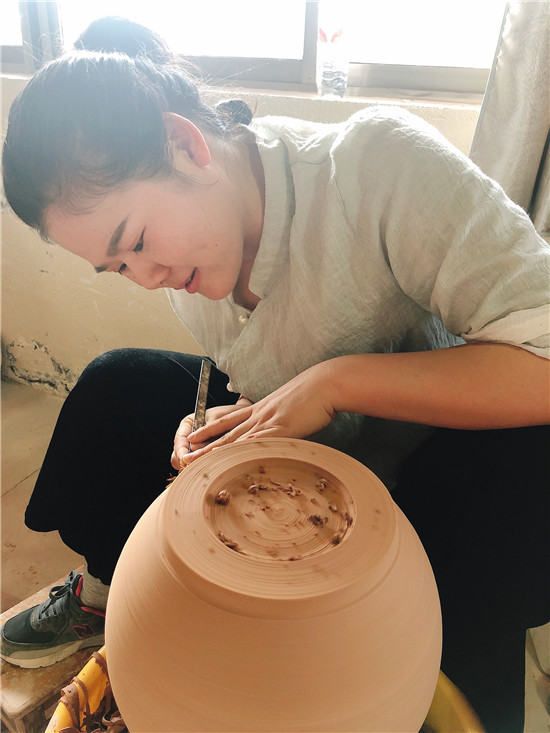 婺州窑瓷器装饰简朴,均为刻划花纹,风格文雅大方。其色泽釉层滋润柔和,釉色青黄带灰或泛紫。唐代时创烧乳浊釉瓷,釉中有星星点点的奶白色出现在釉层开裂处,这是婺州青瓷最显然的特色,因而一直盛烧不衰,延续到宋、元。明代以后,婺州窑式微逐渐淡出了人们的生活。 20世纪以来的考古工作,将沉寂数百年的婺州窑非遗文化重新钩沉出来。金衢地区的瓷艺匠人也孜孜不懈地走上了复兴婺州窑的“圆梦”之路。 要复兴必定会有这样一批人,然投身于此项事业的女性匠人却凤毛麟角,而她是其中一位。 她是一名90后,可别用年龄来判断一个人哦,她获得的奖项与荣誉已不是几页纸可以写得下的了。她叫邵杭平,是浙江省工艺美术大师、浙江省非遗代表性传承人邵文礼的得意弟子,也是邵大师的亲侄女。她从小耳濡目染婺窑青瓷文化,立志长大后要成为像大伯一样的人,把复兴婺州窑文化这一事业传承下去。大学一毕业,她没有被软红十丈、万家灯火的大城市所留住,而是毅然回到生她养她的这方热土,拜大伯为师,以遂少年初心,开始了她的“圆梦”旅途。 “只有通过自己不懈地努力,才可完成小时的梦想,没有捷径好走!”这是邵杭平拜大伯为师的那天悄悄写在日记本的一句话。这些年来,这句话时刻提醒着她,所以在为徒的每一个日子里,她很清楚自己该干什么,不该干什么。经过几年淬炼之后,她熟练掌握了婺州窑设计与烧制的基本技能,并有自己一些独到的创意。师父见她是一棵难得的好苗子,便极力鼓励和支持她另立门户开辟一方新天地。她与丈夫共创了属于他们自己的工作室——婺薪缘工艺品厂。“天道酬勤”,经过几年的打拼,邵杭平一步步成功了,先后荣获为金华市工艺美术大师、首届婺州窑传统技艺大赛“十大技师”、武义县婺州窑非遗代表性传承人等荣誉。 8月,本是酷暑难当的时候。今年例外,“杜苏芮”“卡努”接踵而来,天气甚为凉快。莫负好天气,于是便电话约访邵杭平。听说我要去,邵杭平放下手中的活早早等候在门口了。她的工作室十分宽敞,左边是一个小茶室,右边为作坊,中间未隔开,互为借景,相得益彰。平日里,丈夫以工坊制作为主,而她则更多在茶室创意设计。若空闲时,她可独坐品茗,焚香、吟诗、赏画,也可冥思、遐想、发呆,或有灵感来时便挥笔设计出新颖的图案。