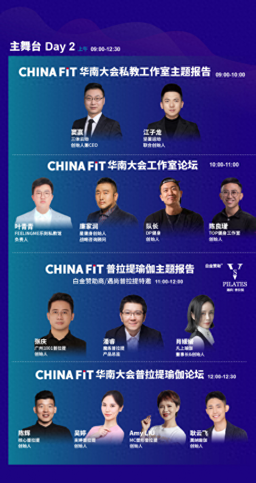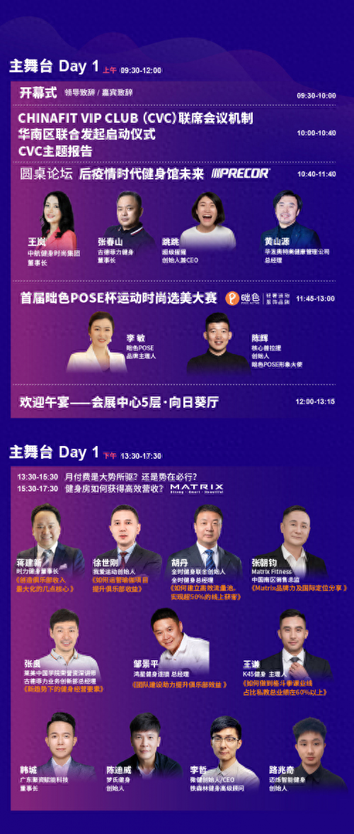 ![]() 主舞台 第一天 开幕式/论坛/报告 09:30-10:00 开幕式 领导致辞/嘉宾致辞 10:00-10:40 CVC华南区联席会议机制启动仪式/主题报告 10:40-11:40 必确-后疫情时代健身馆未来圆桌论坛 12:00-13:15 欢迎午宴 11:45-13:00 昢色POSE杯运动时尚选美大赛 13:30-15:30 月付费是大势所趋?还是势在必行? 15:30-17:30 乔山-健身房如何获得高效营收? ![]() 主舞台 第二天 报告/论坛 09:00-10:00 私教工作室主题报告 10:00-11:00 工作室论坛 11:00-12:00 普拉提瑜伽主题报告 12:00-12:30 普拉提瑜伽论坛 ![]() CVC联席会议机制启动仪式 10:00-10:40 CVC华南区联席会议机制启动仪式/主题报告 ![]() 健身房暴力打流量秘籍班 ![]() 首届普拉提孕产峰会 ![]() 拳馆经营交流大会 ![]() 俱乐部游学 ![]() 昢色POSE杯运动时尚选美大赛 ![]() CHINAFIT团操盛典 ![]() 8间教室百节课程 ![]() |