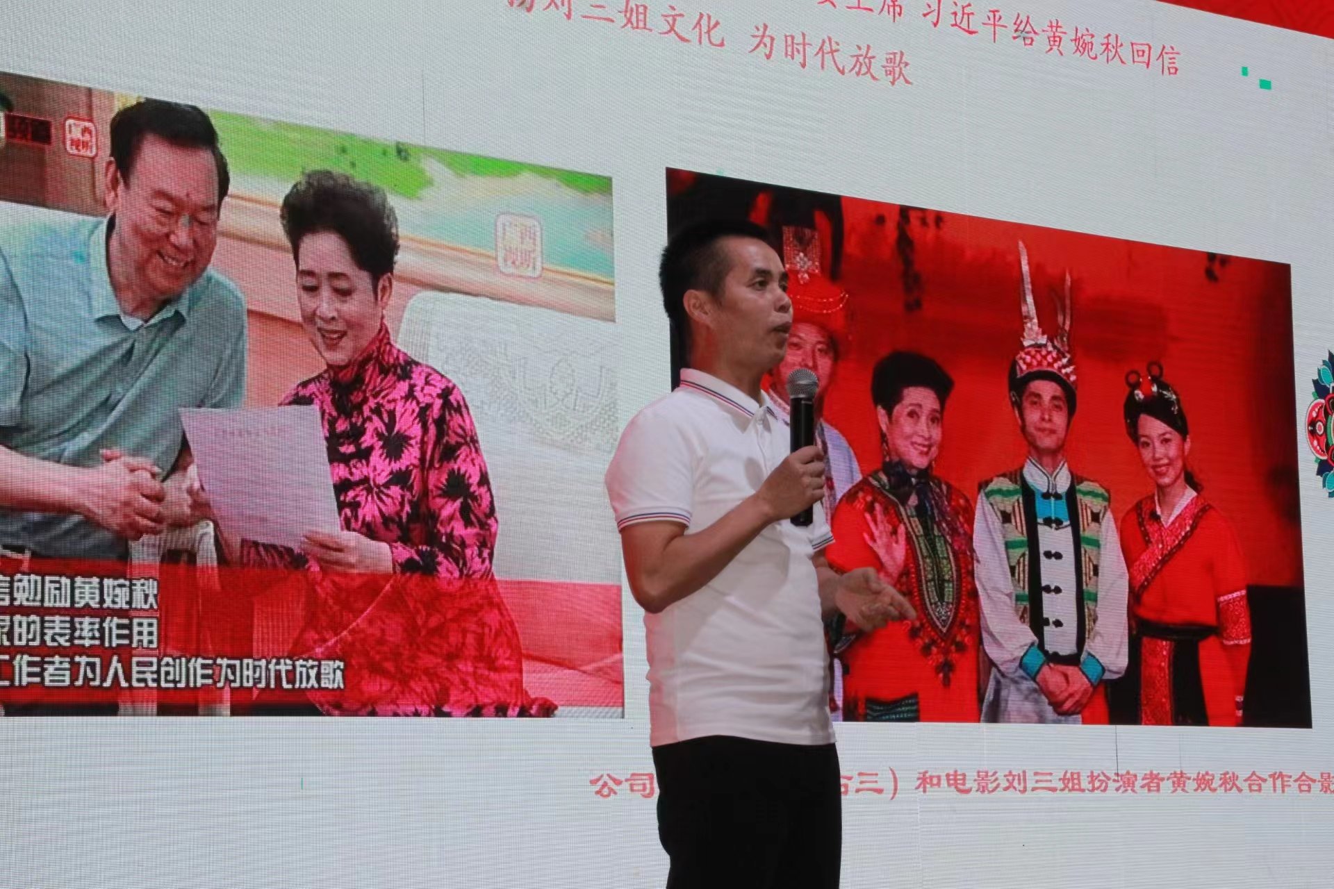 广西壮美刘三姐产业服务集团法人代表、刘三姐品牌总监韦丽珠上台致欢迎词。广西先飞达物流集团总经理 蒙宇明,广西桂林实力科技有限公司总经理文君、广西北部湾文化传媒有限公司董事长潘慧斌等共建刘三姐文化品牌单位企业家们纷纷上台分享……