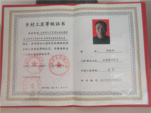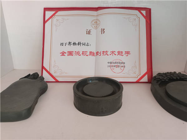 郭栓科先生从事洮砚雕刻行业30多年。2011年曾在兰州品砚堂,跟随陈平红学习洮砚雕刻技艺,擅长雕刻龙凤、山水、人物等。 2012年11月作品《飞天》获第十二届甘肃省工艺美术百花奖制作技艺优秀奖。2014年9月作品《福在眼前》获第十三届甘肃省工艺美术百花奖创作创新三等奖。 2015年8月至2015年9月,在西北名族大学中国非遗传承人群培训班培训,后成立自己的洮砚作坊。 祝郭栓科先生事业有成,为弘扬洮砚工艺创作出新的作品,为弘扬中华优秀传统文化做出更大贡献! (编辑/报道:朱长云)
