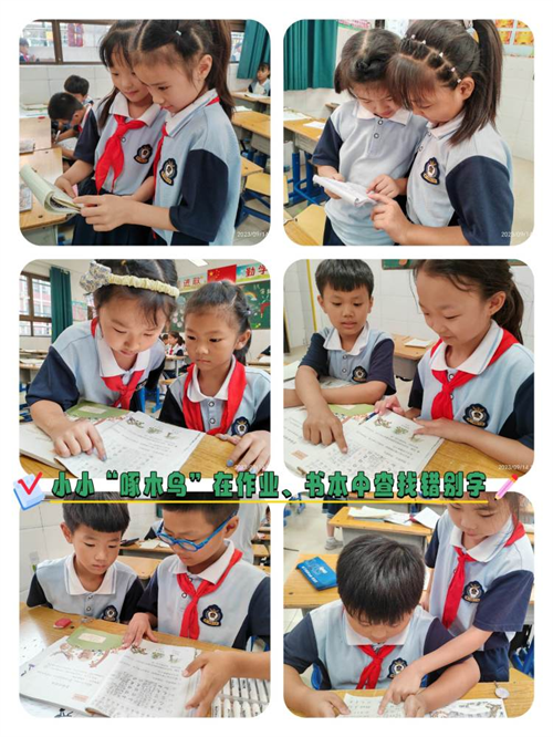 二年级各班的同学们纷纷变身为纠错“啄木鸟”,“啄”出隐藏在文字里的“害虫",用一双双火眼金睛寻找错别字、谐音字等不规范用字,拍照记录并进行纠正。