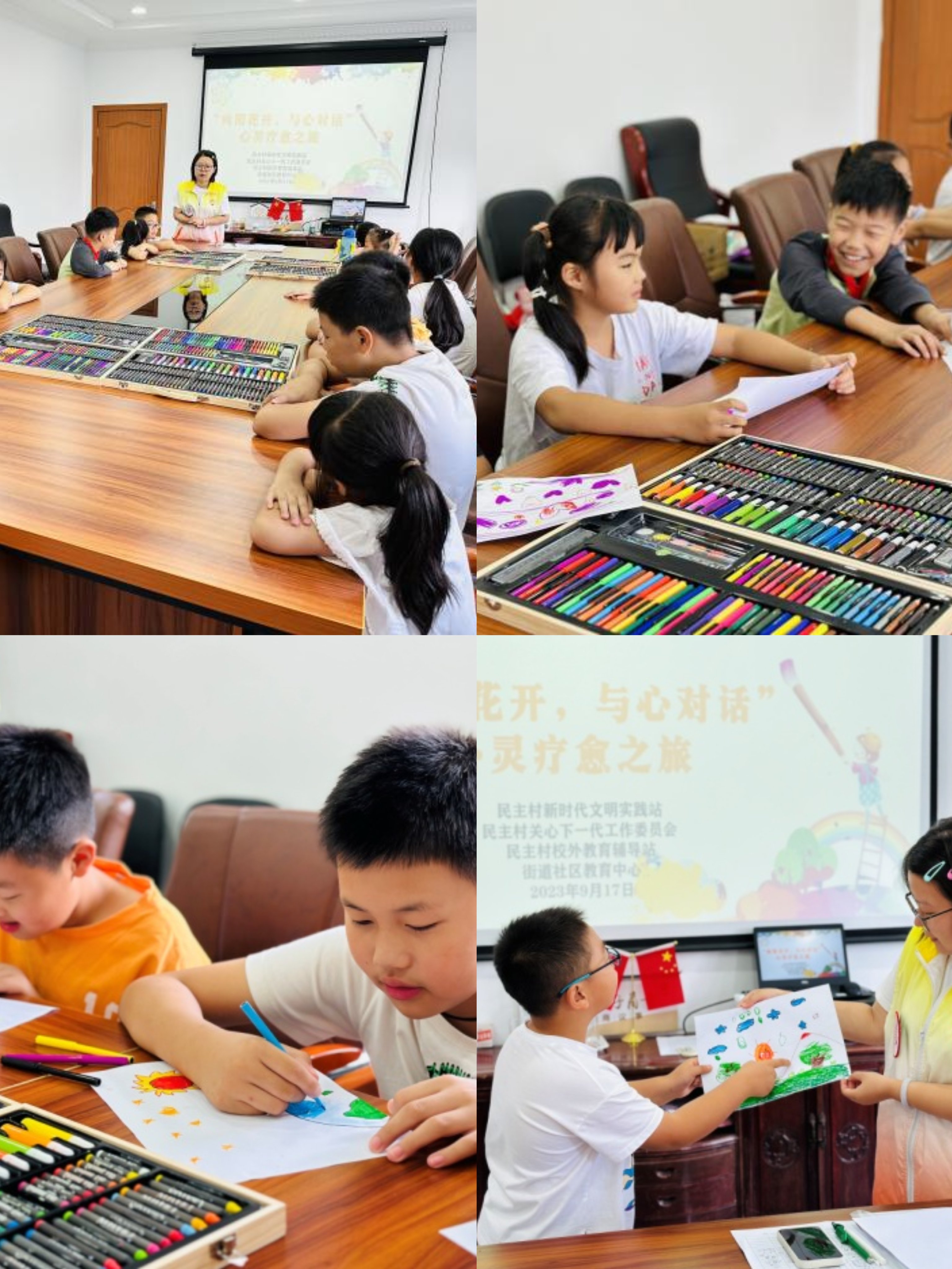 在当下快节奏的生活和学习压力之下,青少年儿童难免容易出现焦虑、抑郁等心理状况, 9月17日,民主村关心下一代、校外教育辅导站联合新活力社会工作服务中心开展“向阳花开,与心对话”心灵疗愈之旅,鼓励青少年儿童以绘画的形式放松身心,并在其中感受自我疗愈,为自己和他人创造一个更加美好的生活环境。