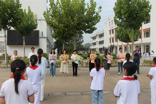 优秀少先队员代表向刚进入我校的8位新老师献花。揭开新学期的帷幕,百禄小学的新教师精彩亮相!他们兼具颜值与才华,他们风华正茂,朝气蓬勃,他们闪耀着青春的活力和满满的热情。竹有千节,始于新笋。8位新教师将怀揣着对教育的热忱,从心出发,重新启航,在百禄小学谱写属于自己的教育新篇章。