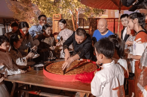 图为 杭州临平塘栖法根食品厂内活动现场 一曲民乐重奏《水调歌头·明月几时有》,让那古老的古琴、瑰丽的箫声、悠扬的胡琴声相互交错,将我们带入夜幕之中,仿佛置身于皓月当空之下,月光洒满大地。 一段情景朗诵《我的中秋》。朗诵者带领大家穿越时空,温柔地讲述着自己与中秋的故事,让大家在这个美好的夜晚,找回属于自己的中秋记忆。 琵琶的悠扬声响起,《雨碎江南》泛起层层涟漪,拨动着大家心底最柔软的地方,让大家重新拥抱那份温暖。 今夜的中秋之约特别璀璨,法根出品的“团圆大月饼”,更是添了一层美丽的风景。现场,由非遗传承人李法根以及第三代传承人李婷共同切割着月饼,每一切都如同艺术家的舞蹈,轻盈而灵动。月饼的香气,弥漫在品月会的每个角落,仿佛是每一份思念和祝福都凝结成了这样的美食。细细品味,仿佛置身于孟光、嫦娥的神话之中,悠然自得。