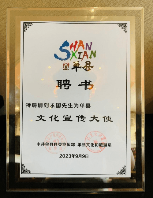 单县文化和旅游局党组书记李强向八雅先生刘永国颁发:单县文化宣传大使聘书