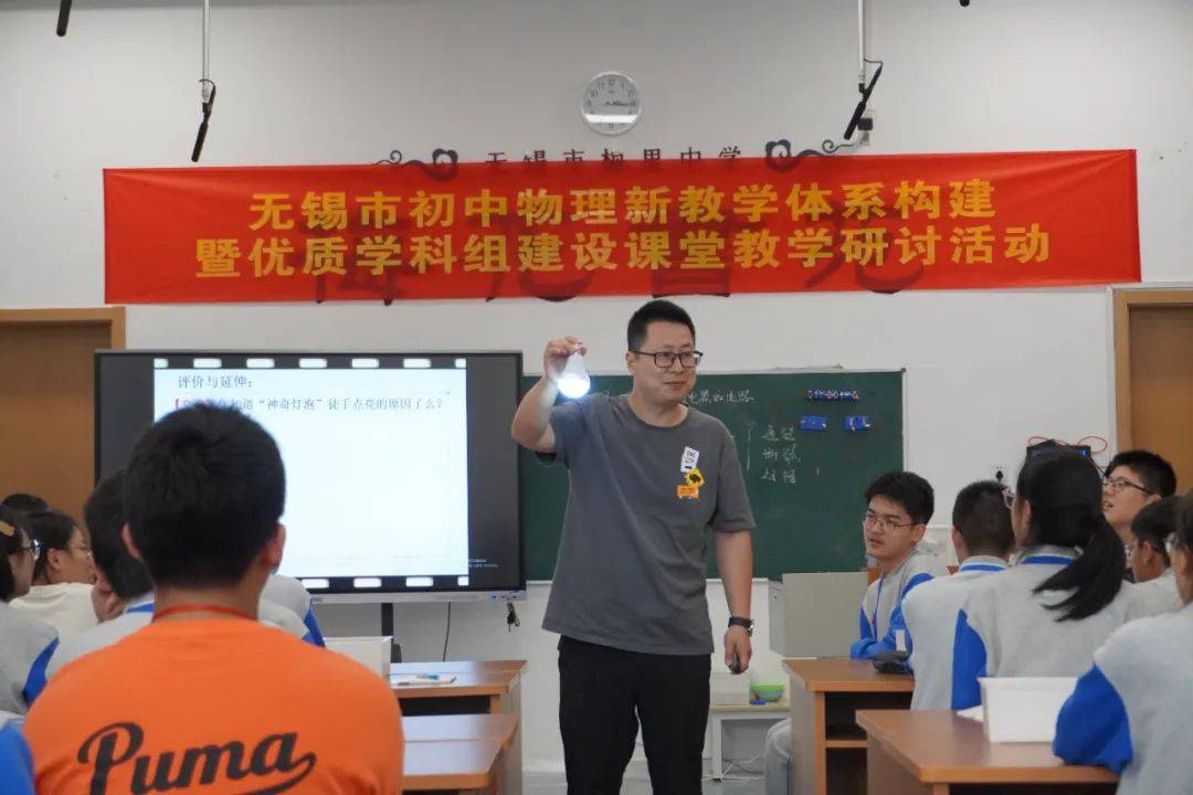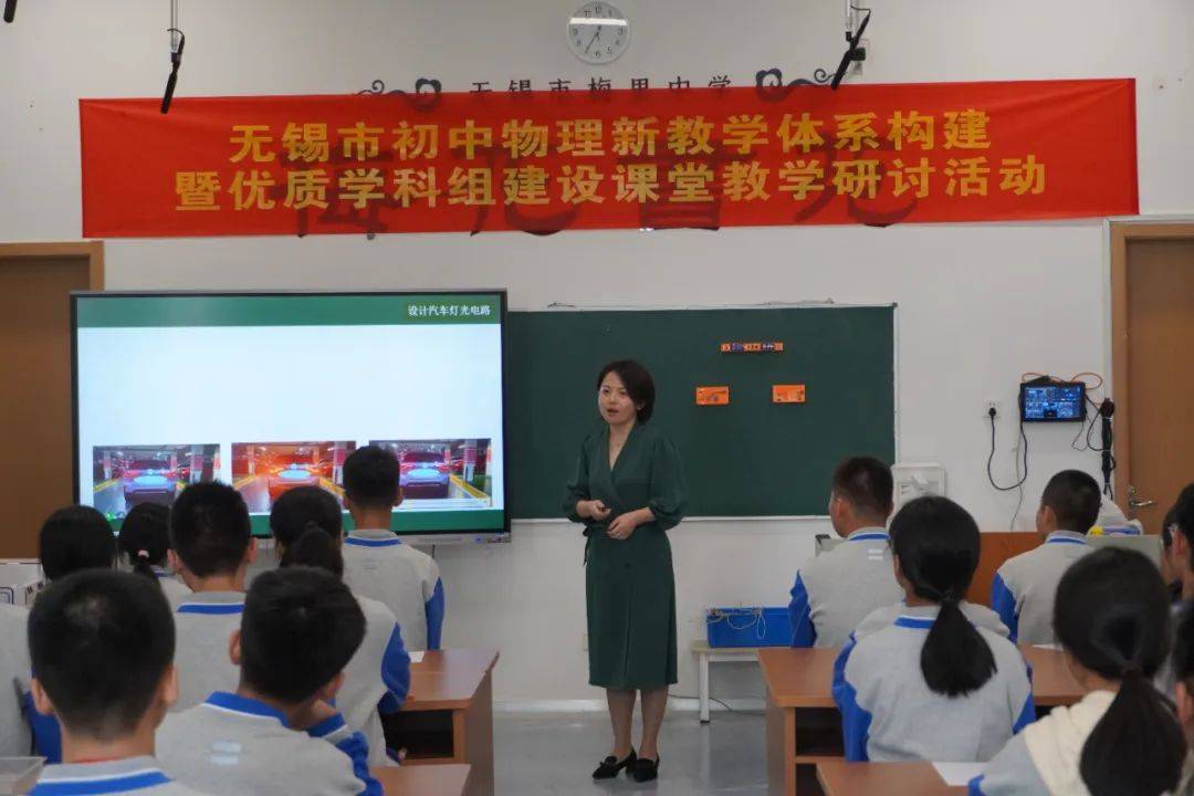 贰 课堂实践 18日下午,多位骨干教师基于构建学科育人视角下的“新教学”体系,提升义务教育物理教学质量的目标,开设了多种类型的示范研讨课。 无锡市梅里中学的周梁琴老师开设了综合实践活动课《设计汽车灯光电路》,周老师基于生活实际需求,设计任务情境,开展项目化学习。
