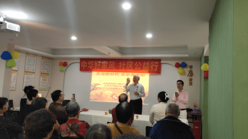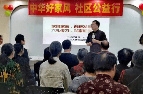 在老人们尽情欢乐之后,“中华好家风 社区公益行”活动发起人、中华礼仪文化传承人李国辉老师做主题宣讲《家风传习 代代赓续》,从五福临门,讲到五好家庭;从古代孔孟圣贤教育,讲到现代家庭教育困惑。他说,开展“中华好家风 社区公益行”活动,是遵循《关于进一步加强家庭家教家风建设的实施意见》精神,在社区开展的活动,在这美好的重阳节里,我们要充分发扬老同志的余热,弘扬中华传统美德,加强家庭家教家风建设,推动明大德、守公德、严私德,提高社区居民道德水准和文明素养。