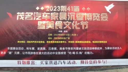 2023年第41届茂名汽车、家具、沉香、美食展隆重开幕! 9月8日-10日,在粤西农批广场,一场香车家具展的活动举办得如火如荼。30多个汽车品牌、超100个家具商家、20个电白沉香品牌隆重登场,歌舞表演、汽车大抽奖等,靓丽展现浓浓的中国风,香民现场展示沉香香料制作,众多网红前来打卡。 引起了广东名嘴林颐等明星的关注和支持! 主办方还为市民免费赠送了300份沉香礼品,尽管是下雨天气,依然阻挡不了市民的购买热情! 电白区素有“中国沉香之乡”美誉,是我国天然沉香的中心分布区之一,采集加工沉香的历史传统而悠久。 电白沉香作为"五棵树一条鱼一桌菜"之一,从花开数朵到遍地“飘香”,电白沉香迈向下一个“百亿”。 2022年,电白沉香全产业链总产值已达约40亿元,培育发展一大批电商、直播、休闲观光农业、森林生态旅游、农家乐等新业态,继续加速向未来年产值100亿元的目标迈进。 各参展的沉香品牌商家反映,本次展会未今年以来最大型,销售情况最好的展会。