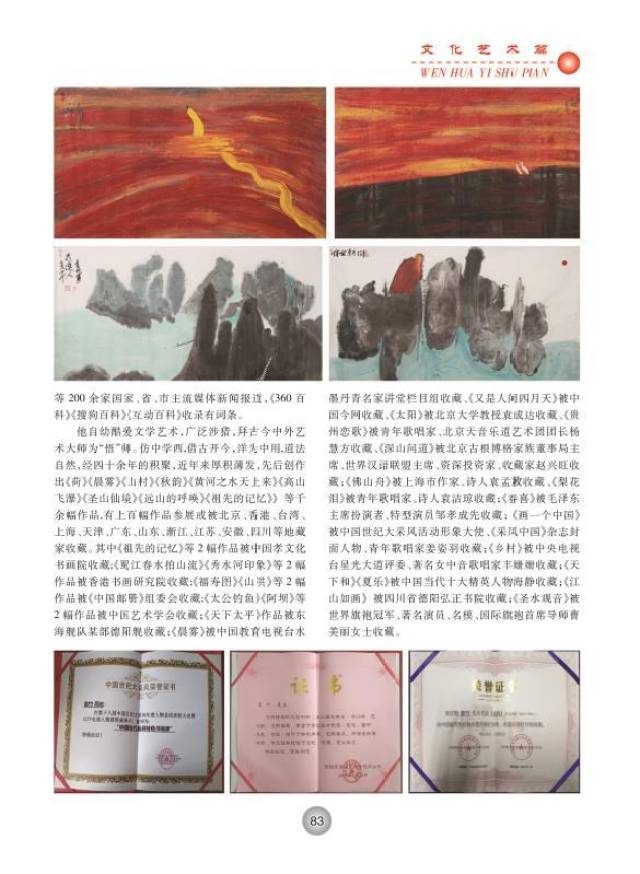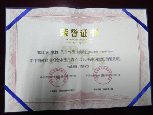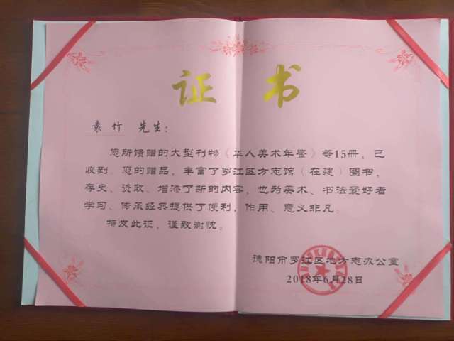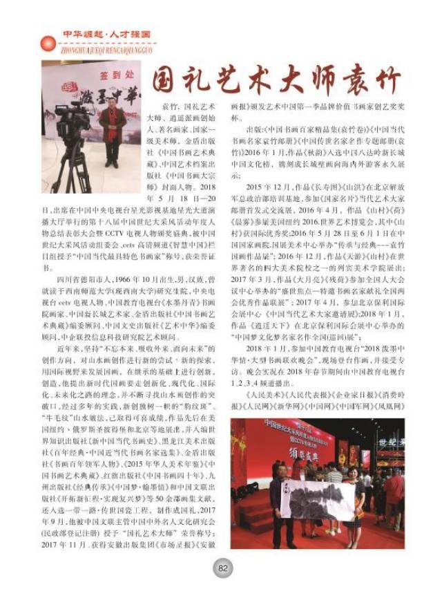 2019年2月26日, 逍遥派画创始人、中国新长城艺术家、北京宣和书画艺术研究院副院长、著名画家、国家一级美术师、《中国书画艺术典藏》封面人物、《新中国当代书画史》《百年经典·中国近当代书画名家选集》、《书画百年领军人物》、《中国书画40年》、《创新中国人物志》、《致敬经典·中国书画传承代表人物》等50余部画集(文献)入选者袁竹先生,收到了从四川中国西部研究与发展促进会、《科教兴国》丛书编委会寄来的《中华崛起》大型文献。该大型文献由中国广播影视出版社出版。 CIP核字号验证 图书在版编目(CIP)数据 中华崛起·人才强国 : 聚天下英才而用之,助千里 马插翅腾飞 / 曾荣禄主编. -- 北京 : 中国广播影视出 版社, 2018.10 ISBN 978-7-5043-8205-4 Ⅰ. ①中… Ⅱ. ①曾… Ⅲ. ①高技术-技术人才-人 才培养-研究-中国 Ⅳ. ①G316 中国版本图书馆CIP数据核字(2018)第237987号 他应四川中国西部研究与发展促进会丛书编委会的邀请,其独创的4幅美术作品被收录在《中华崛起·人才强国》大型文献,该大型文献由国家级出版社中国广播影视出版社于2018年10月正式出版发行。全国各地新华书店经销。