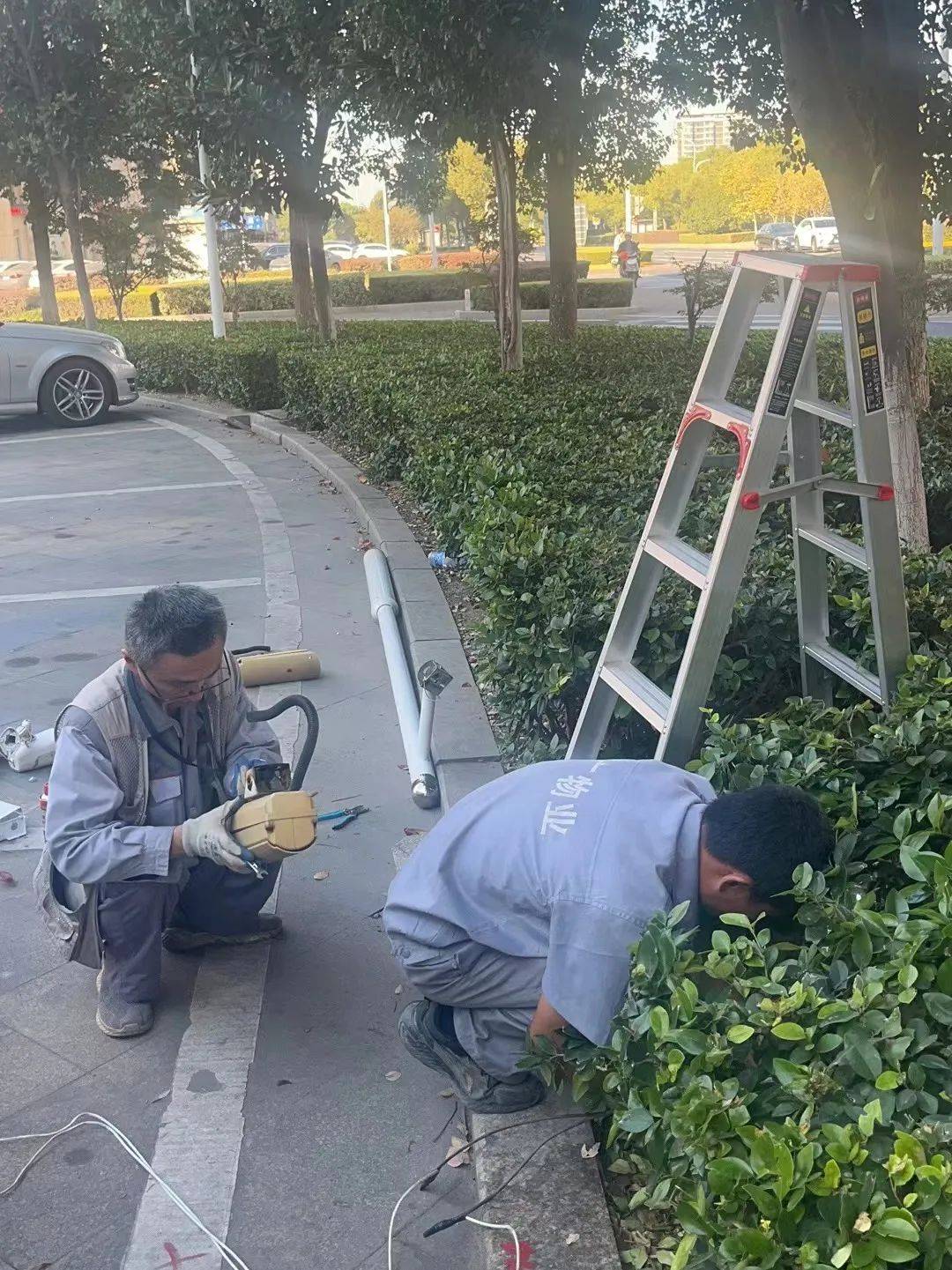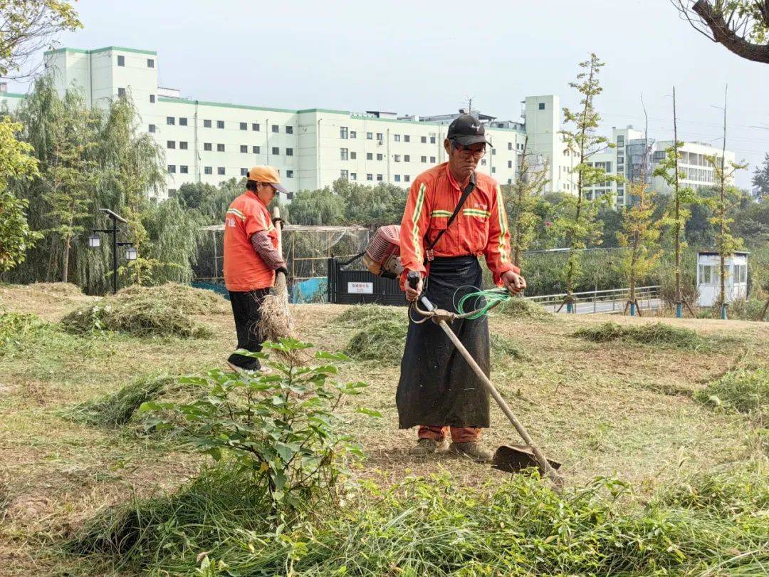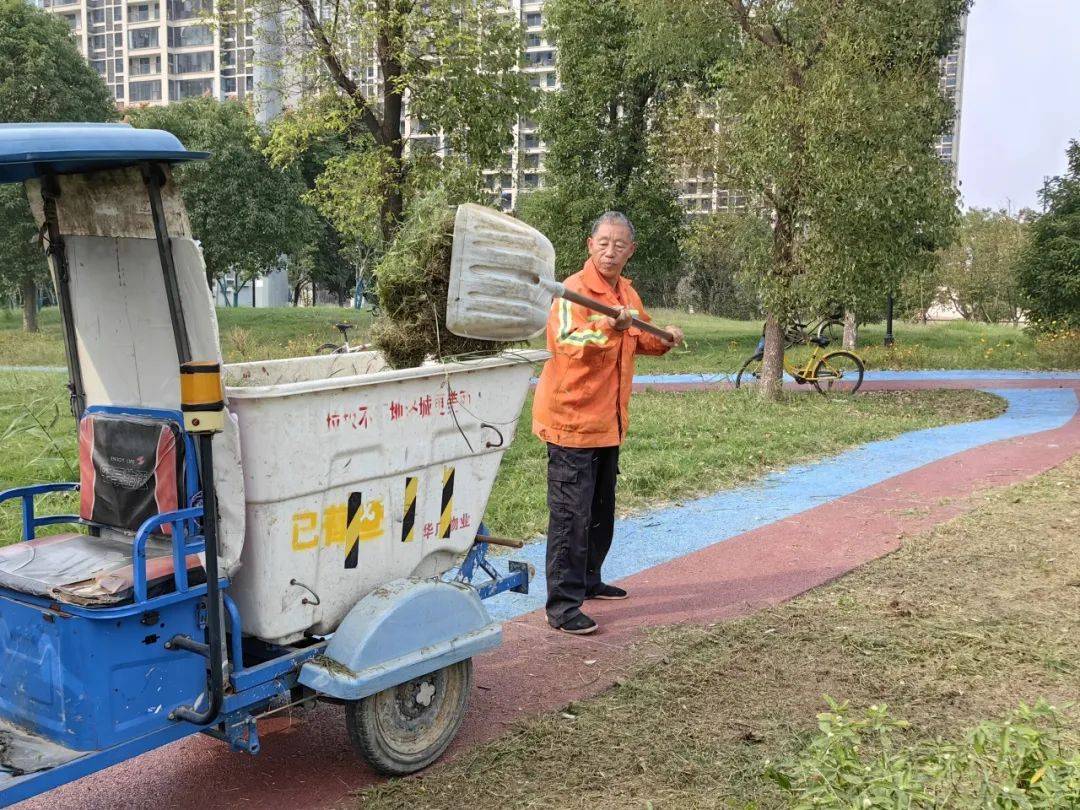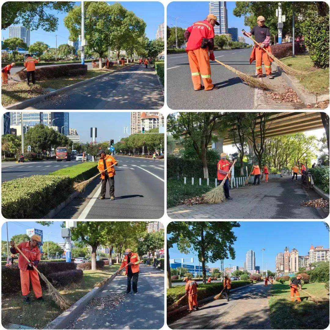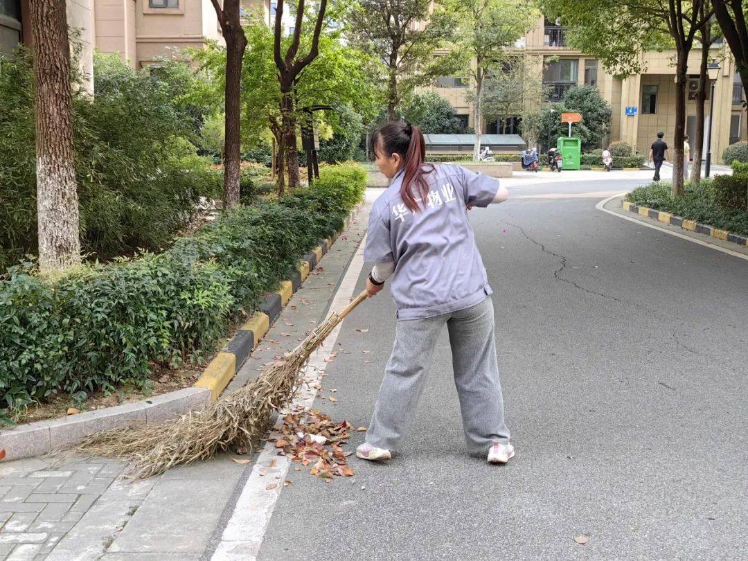 华广物业的绿化工们正忙碌地扫着树叶,他们手持着扫帚,专注而又细致,他们动作迅速有力,仿佛在舞动着一支美妙的交响乐。而树叶在他们的扫帚下翩翩起舞,轻轻飘落在地面上,宛如一场黄金的盛宴,为洛城增添一抹秋日的美好。