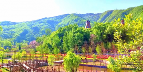 省院领导和洛阳分院胡太明院长在山湾风车村标志前合影 在栾川的沟岔间,分布着大大小小无数个村落,偏远闭塞使很多深山里的村庄平穷落后,山湾村便是其中一个。受政府邀请2019年回国在栾川县庙子镇创意设计的一个休闲农业精准扶贫项目。因为胡太明院长常年德国生活工作的关系,常去欧洲国家走访研学,曾经在菏兰Zaanse Schans小住,记忆深刻!在对山湾村的地理地貌和当地文化考察后了解到,文化植入缺乏历史背景和理论依据。但是山湾村的地貌和荷兰风车村很像,在经过缜密思考和请示相关领导后,确定以“山湾风车村”为项目主题设计定位,形成了符合传统风格兼顾网红打卡特色的中国版“山湾风车村”。以“风车”为元素,打造儿童游乐场、美食广场、农耕研学等特色项目。结合自然资源和地区文化,合理布局产业项目,提炼个性鲜明IP,明确市场定位,用特色IP统领环境建设、景观节点、旅游产品、业态打造和市场营销。使本无特色产业的村落,实现乡村差异化发展。山湾村也以“风车小镇”的新形象,吸引周边游客纷至沓来,打造成了栾川乡村旅游新地标。