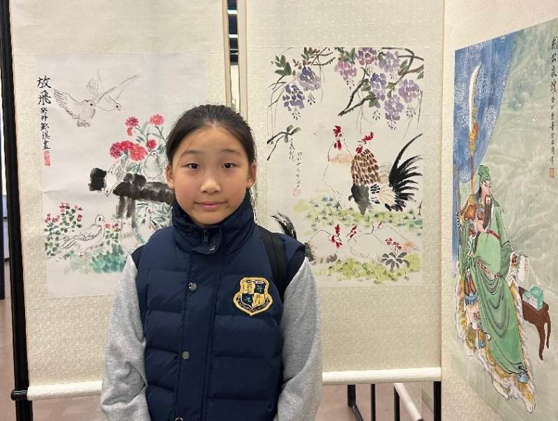 由上海西外外国语学校 六(11)班 章赵乐(Leanna Zhang)同学画的国画《金鸡报晓》尤为突出。她运用十字定位法构图。然后注重定位公鸡的头部,鸡冠,嘴巴,眼睛的细节刻画和腿部大概的位置定型,再从鸡头-脖颈-胸部-腿部-脚掌的顺序逐一绘画,而且绘画步骤井然有序。公鸡的身体运用浓墨和淡墨相结合,用笔触去表现公鸡身体的体积感,而且绘画中水分的控制也是比较出色的。用曙红或者用大红来加强绘画鸡冠,使得整幅绘画作品看上去栩栩如生,简洁又明了。这样的绘画功底离不开她的国画启蒙李向东老师的谆谆教导与她自幼刻苦学习中国画是密不可分。